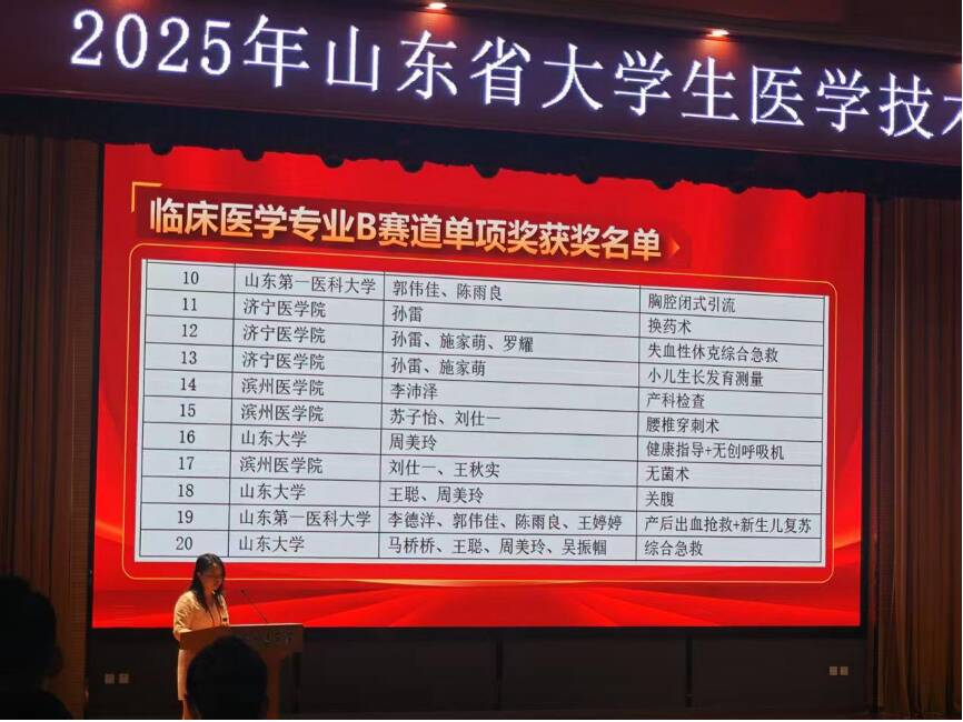 5月9日至11日,由山东省教育厅、山东省卫生健康委员会主办,滨州医学院承办的2025年山东省大学生医学技术技能大赛在烟台顺利落下帷幕。学院学子凭借扎实的专业基础与出色的现场发挥,在临床医学专业B赛道获团体一等奖单项奖,充分彰显了学院在实践教学方面的卓越成果。