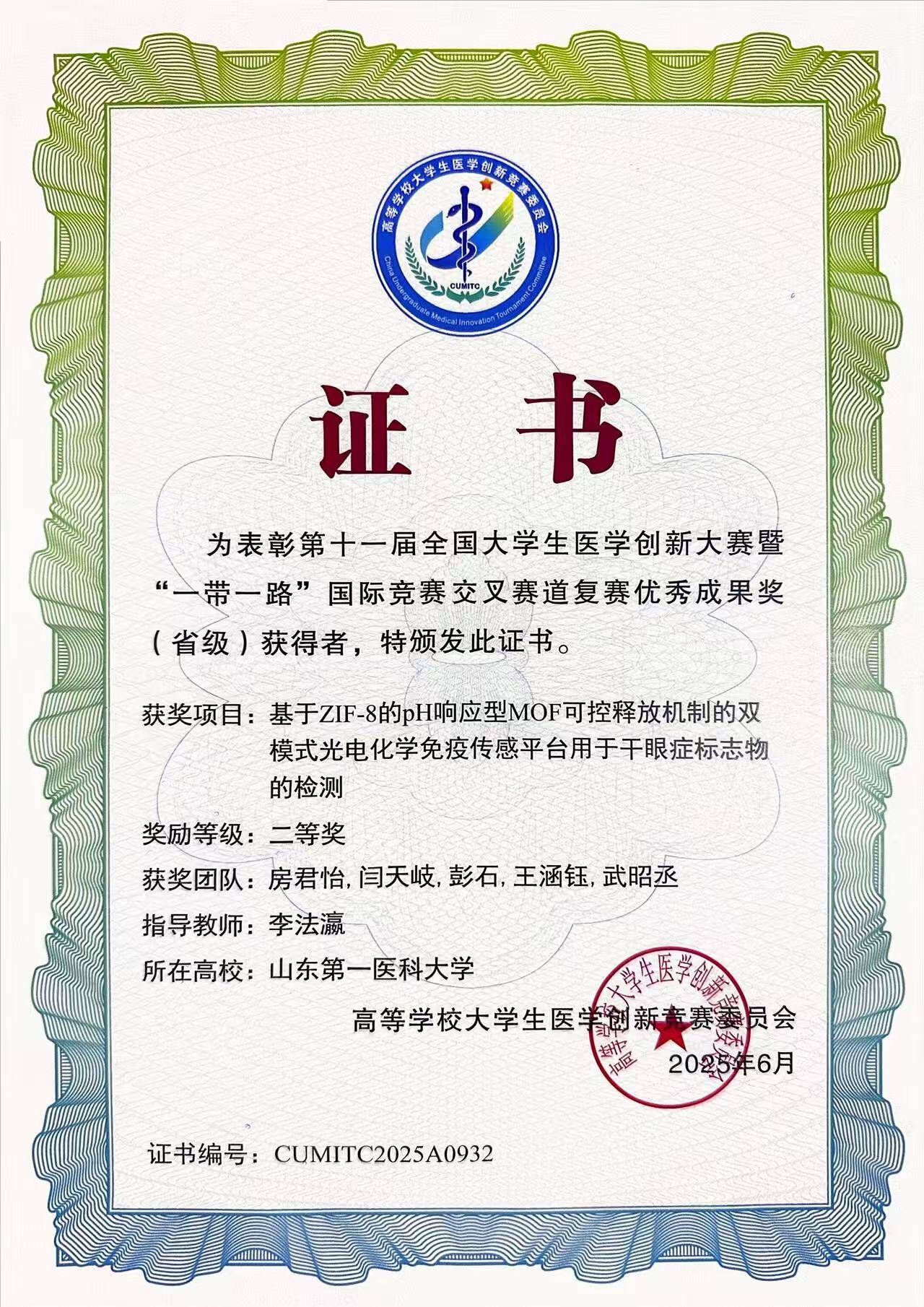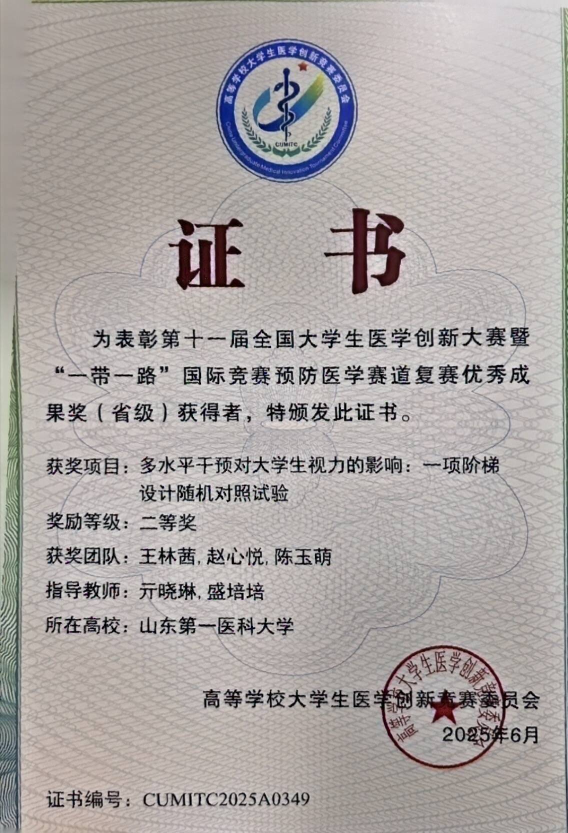 6月6日至8日,由高等学校大学生医学创新竞赛委员会主办、西南医科大学承办的第十一届全国大学生医学创新大赛暨2025“一带一路”预防医学赛道复赛在西南医科大学举行。7月5日至7日,交叉学科赛道复赛在湖南中医药大学举行。眼科学院的参赛团队在比赛中表现出色,最终斩获省级二等奖2项,为眼科学院赢得荣誉。