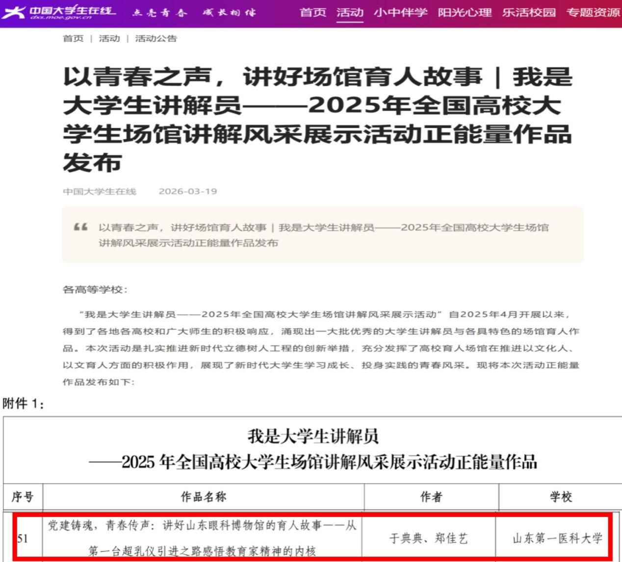 由教育部中国大学生在线主办的“我是大学生讲解员——2025年全国高校大学生场馆讲解风采展示活动” 正能量作品名单已正式公布。眼科学院眼科文史学社成员共同创作的作品《党建铸魂,青春传声:讲好山东眼科博物馆的育人故事——从第一台超乳仪引进之路感悟教育家精神的内核》成功入选。